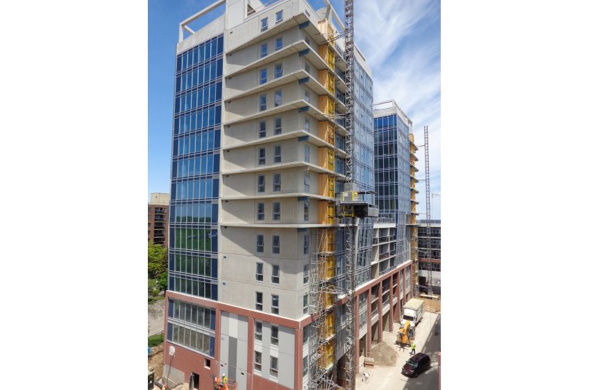 Stubbe’s completed 8,400 sq. ft. of flooring and 4,300 sq. ft. of wall panels for one tower in just three days—an example of how total precast construction can dramatically accelerate timelines on large-scale residential projects.