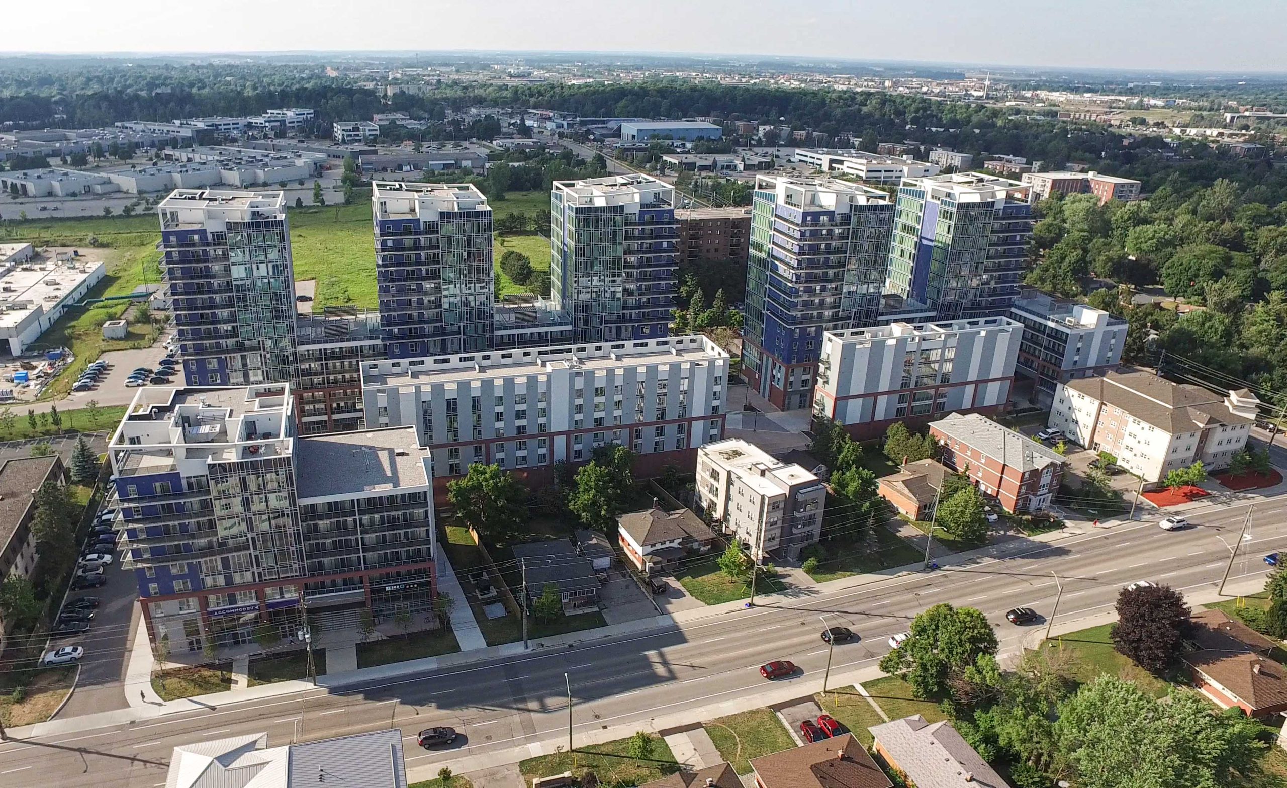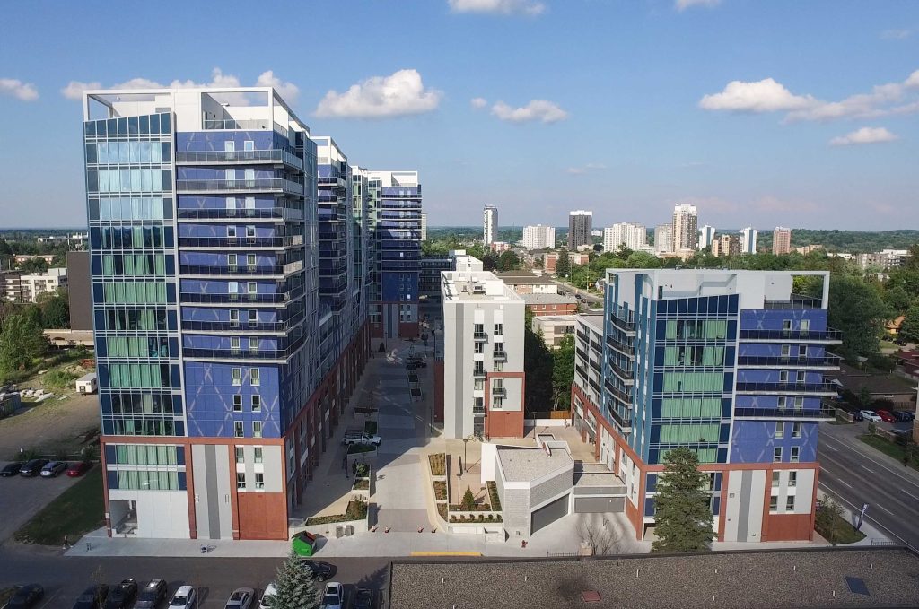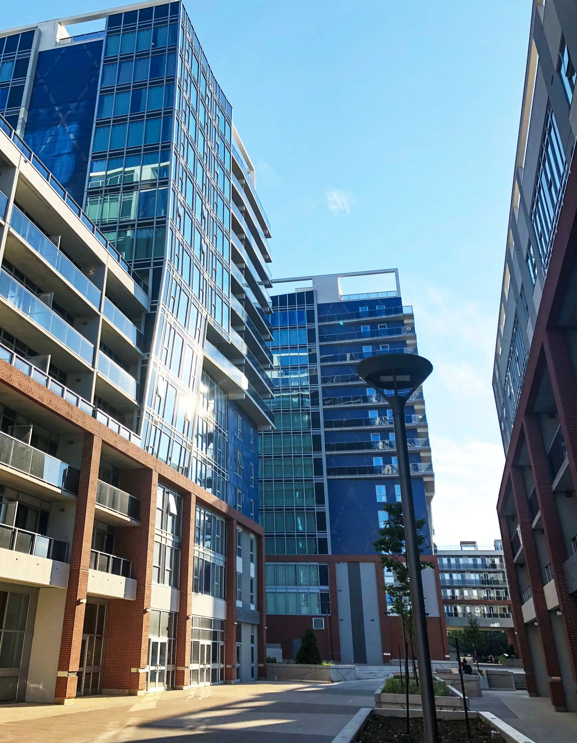 The five towers are unified by a shared underground parking structure and pedestrian promenade, demonstrating how total precast can support complex, multi-building developments with both structural efficiency and cohesive urban design.