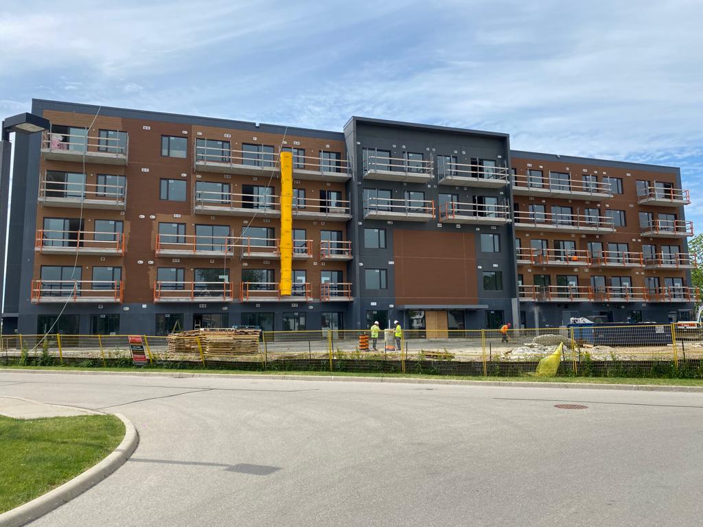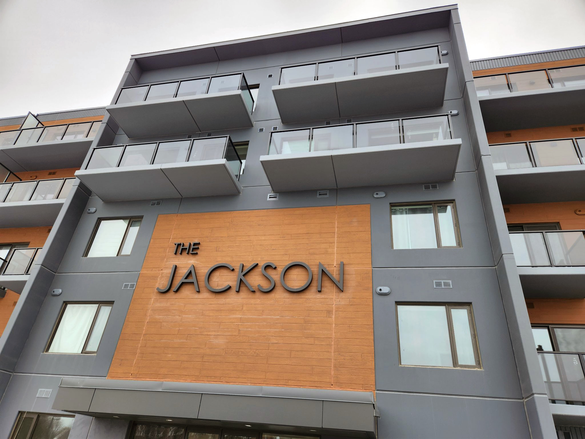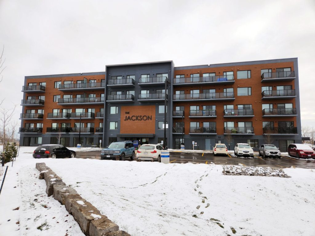 The Jackson is a five-storey, 74,639 square foot total precast condominium featuring a mix of one- and two-bedroom units. The building includes over 1,000 precast elements such as wall panels, beams, columns, hollowcore slabs, balcony slabs, stairs, and landings. Wall panels reached up to 35 feet long and 10.5 feet tall, with thicknesses ranging from 6″ to 17″, and weighing as much as 40,000 lbs. The exterior panels were cast with form liners in steel molds to create a variety of finishes, including brick, wood, and fluted textures. Uniquely, all balconies are cantilevered from interior slabs, giving a floating appearance. Windows were pre-installed in the precast panels at the plant, and doors were added on-site during erection, allowing for faster enclosure of the structure. Located along a main thoroughfare, The Jackson stands out as a modern architectural landmark in this growing community.