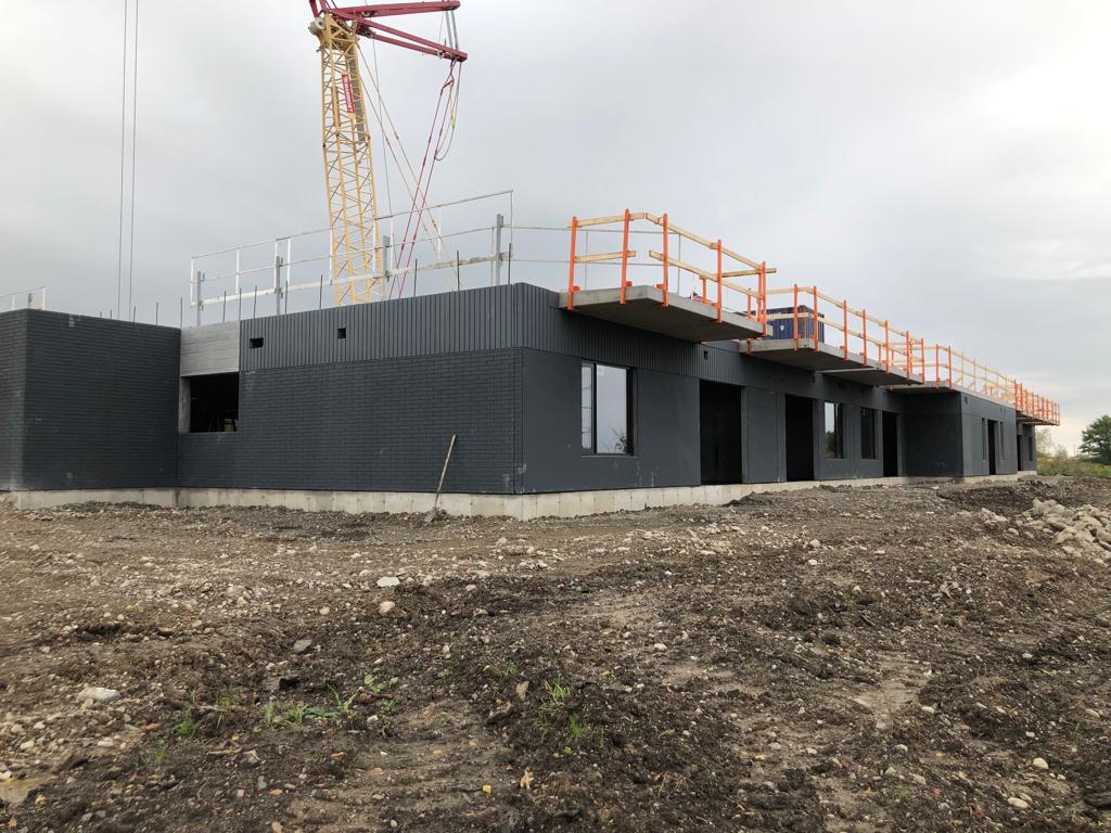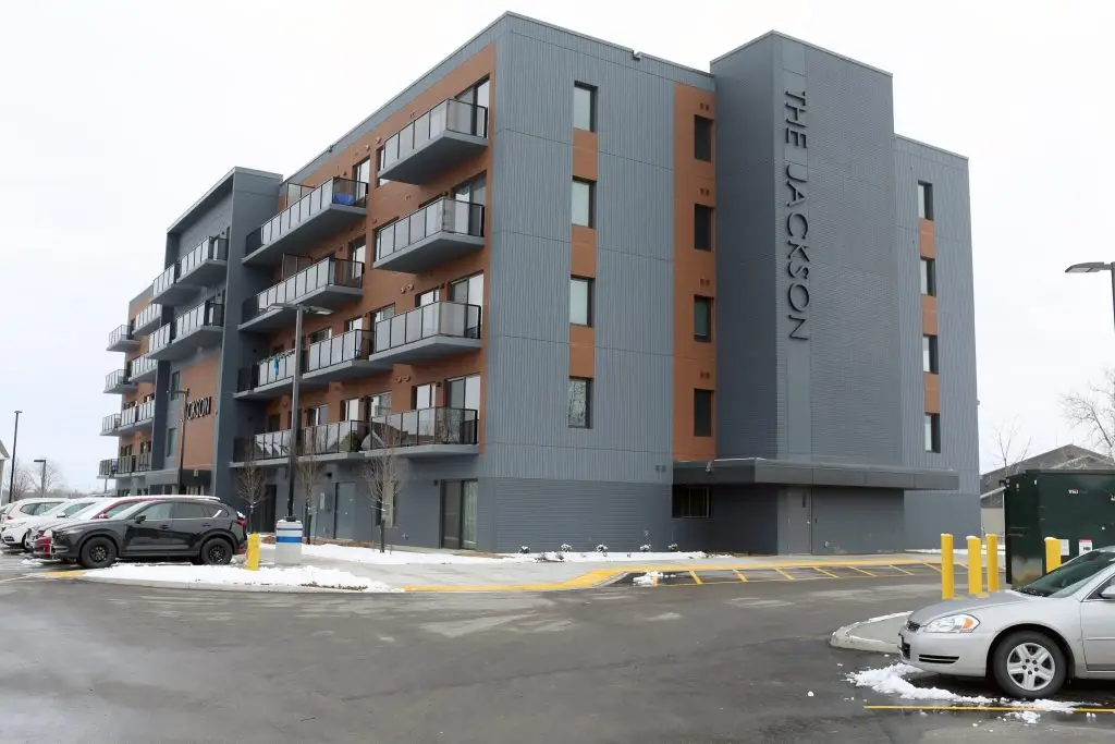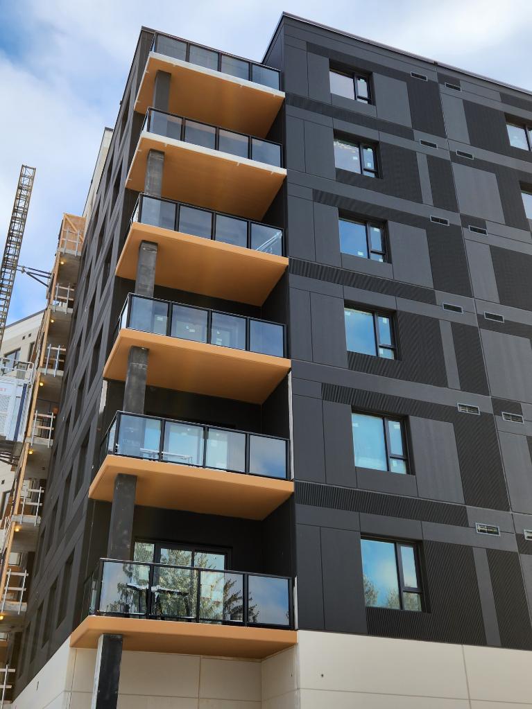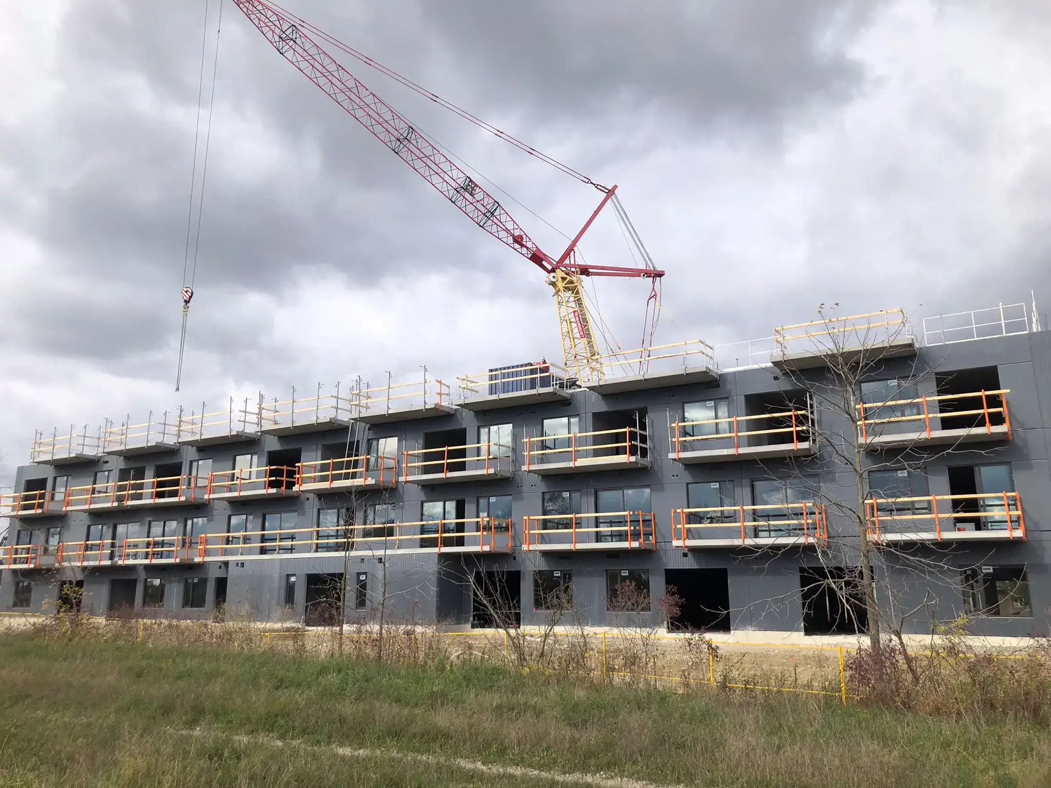 The Jackson is a five-storey, 74,639 square foot total precast condominium featuring a mix of one- and two-bedroom units. The building includes over 1,000 precast elements such as wall panels, beams, columns, hollowcore slabs, balcony slabs, stairs, and landings. Wall panels reached up to 35 feet long and 10.5 feet tall, with thicknesses ranging from 6″ to 17″, and weighing as much as 40,000 lbs. The exterior panels were cast with form liners in steel molds to create a variety of finishes, including brick, wood, and fluted textures. Uniquely, all balconies are cantilevered from interior slabs, giving a floating appearance. Windows were pre-installed in the precast panels at the plant, and doors were added on-site during erection, allowing for faster enclosure of the structure. Located along a main thoroughfare, The Jackson stands out as a modern architectural landmark in this growing community.